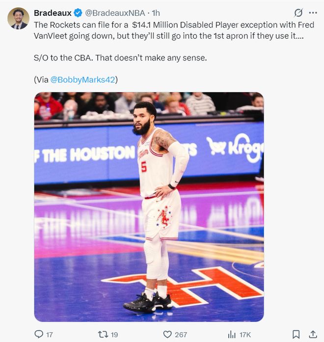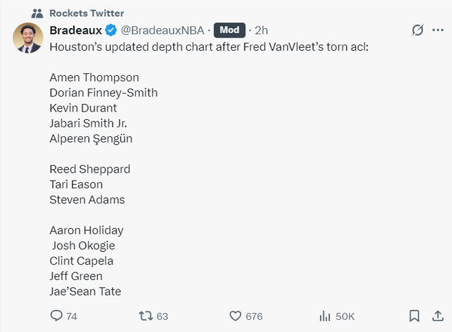 他晒出范弗利特遭遇赛季报销后火箭队的阵容: