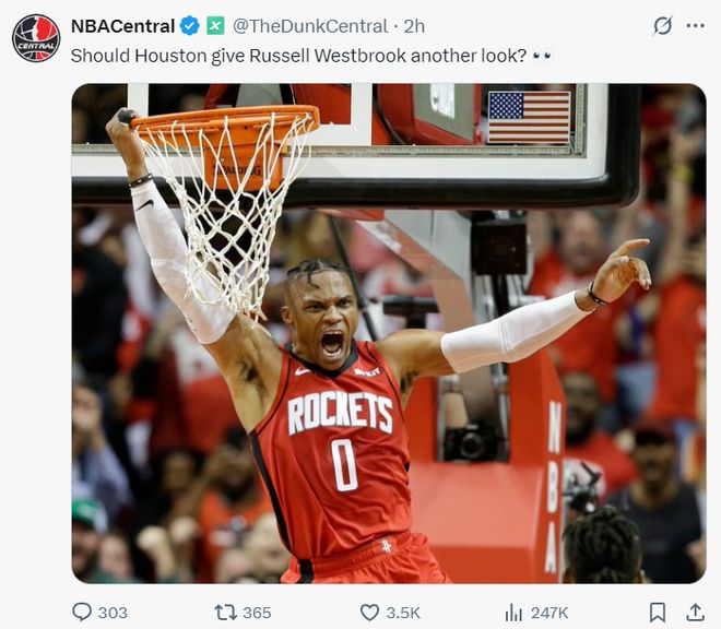 美媒NBA Central询问火箭球迷:休斯顿再给拉塞尔-威斯布鲁克一次机会可以吗?