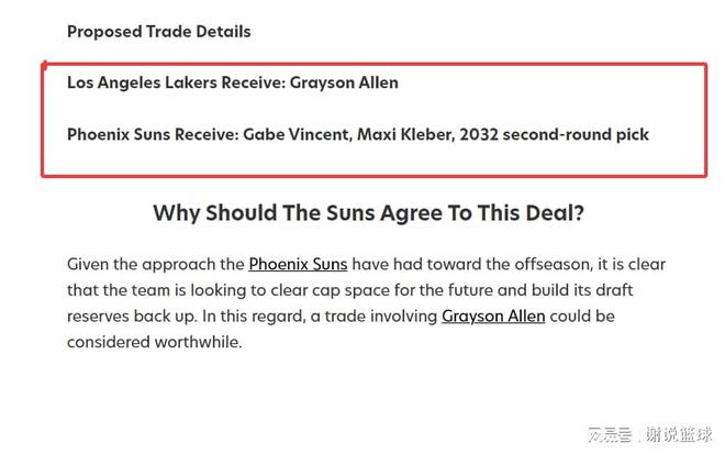 因此媒体FW就支招湖人,考虑跟太阳进行交易,可以去追求恶汉格雷森-阿伦。而从具体方案来看,湖人这边送走两替补盖布-文森特和马克西-克勒贝尔,再加上一个2032年的次轮签,同样被当成筹码。
