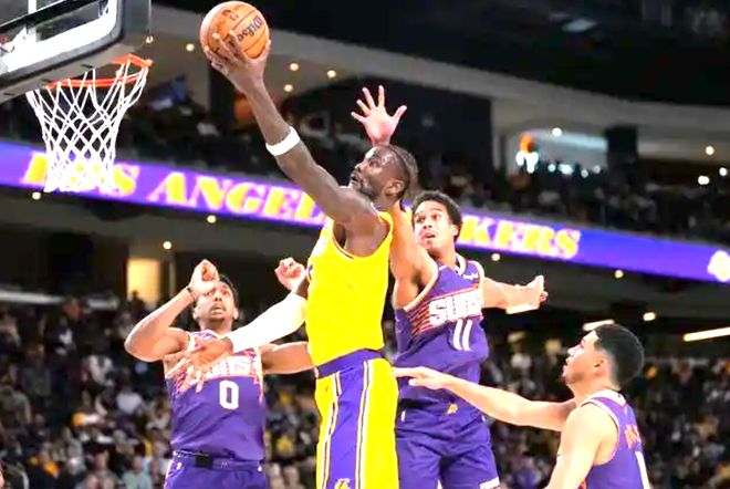 全场20分的数据单,是里夫斯在这场灾难级比赛中唯一的光亮。开赛初期他与八村塁轮番取分,用标志性的急停跳投为湖人打开局面;第二节太阳进攻失准时,又是他单枪匹马扛起进攻大旗,突破造杀伤、中距离跳投连中,一度将两位数分差迫近到可追范围。作为球队临时核心,他的表现完全配得上期待——进攻端既能持球发起挡拆,又能在无球端切入得分,全场没有出现一次失误,成为湖人混乱进攻中唯一的稳定器。