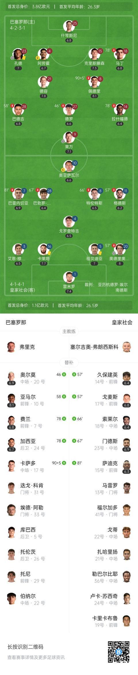 第59分钟,奥尔莫分球,替补登场的亚马尔右路突入禁区,随后传中球送到门前,莱万头球攻门击中立柱弹进网内,巴塞罗那2-1皇家社会。↓