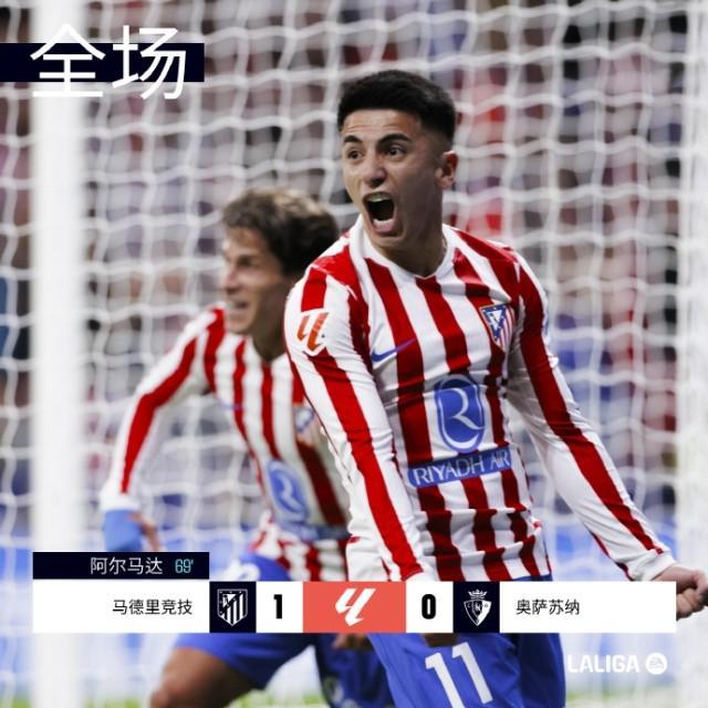 西甲第9轮,马竞主场1比0小胜奥萨苏纳,排名升至第4位。第9分钟,阿尔瓦雷斯销魂直塞助攻巴埃纳首开纪录,但主裁判观看回放后判定格列兹曼阻挡后卫犯规(图②),进球无效。第63分钟阿尔马达复出换下巴埃纳;第69分钟,朱利亚诺·西蒙尼右路突破下底传中,阿尔马达门前包抄打入全场唯一进球(图③)。